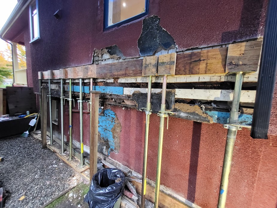 Our client reached out when they noticed a small leak on an exterior wall. We started slowly removing stucco to assess the damage. It turned out the leak had been dripping for years and completely rotten the joists holding up the cantilevered wall, which held the roof, a major disaster waiting to happen. We used jacks to lift the entire wall back to height, removed all the rotten framing and re-built all structural members. After a green light from the engineer, we installed a new building membrane and stucco.