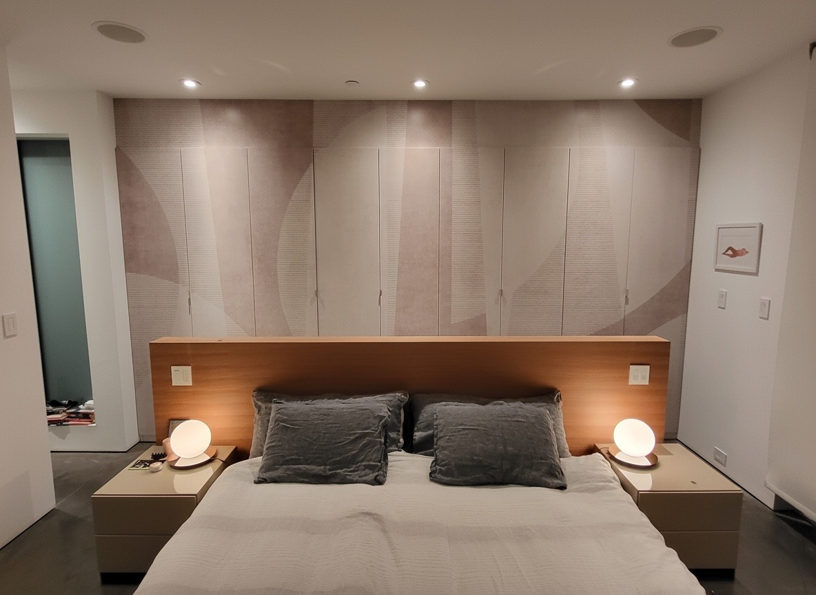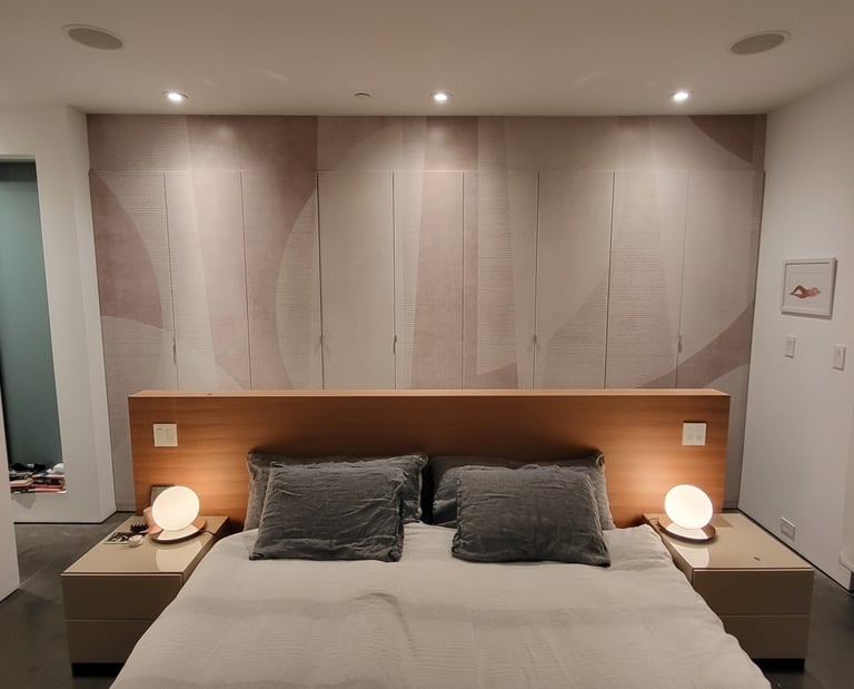 In this master bedroom, we cut the headboard wall down to open the room up. We then installed fillers above the wardrobe for a clean floor to ceiling look. The wardrobe was then covered with a beautiful wallpaper, turning it into a piece of art. Finally, we wrapped the front, sides and top of the headboard wall with a white oak vaneer.