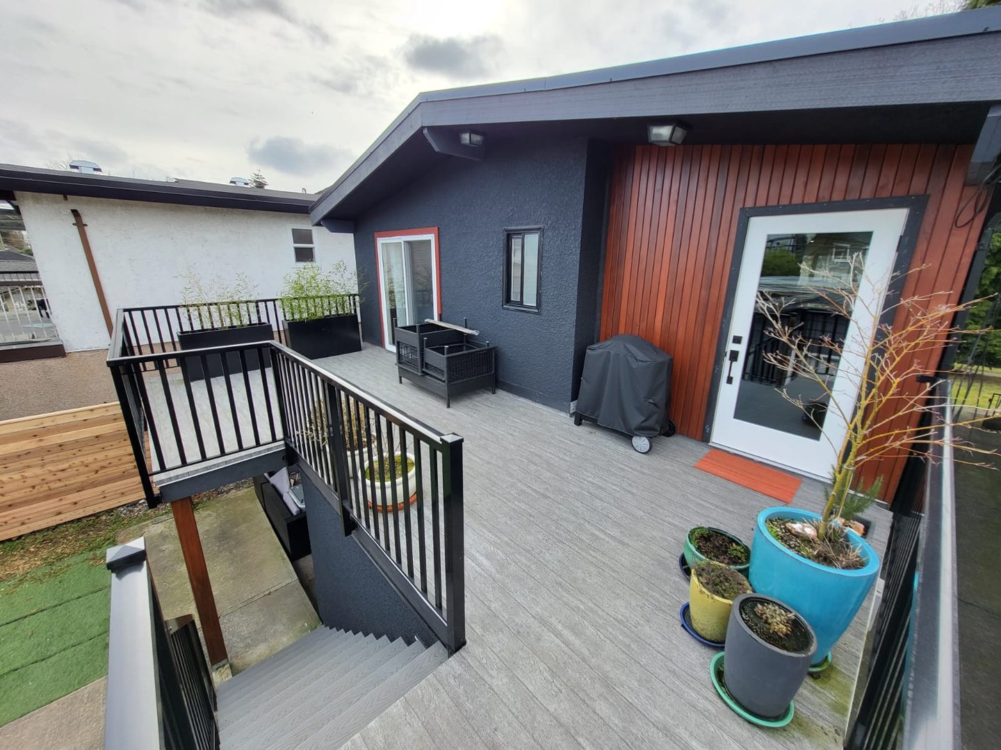 The enclosed deck on this house was falling apart and our client wanted to open it up to be used as a summer time patio. The deck was sloped towards the house, so we installed sloped sleepers across the deck to adjust the angle away form the house. We built stairs, installed new railings and a beautiful cedar feature wall.