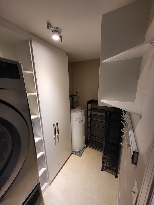 This little laundry room needed some new storage space badly. We installed new cupboards with side shelving on one side, and floor to ceiling cabinetry with side shelving on the other. We also added a corner shoe rack and coat rack for more organization.